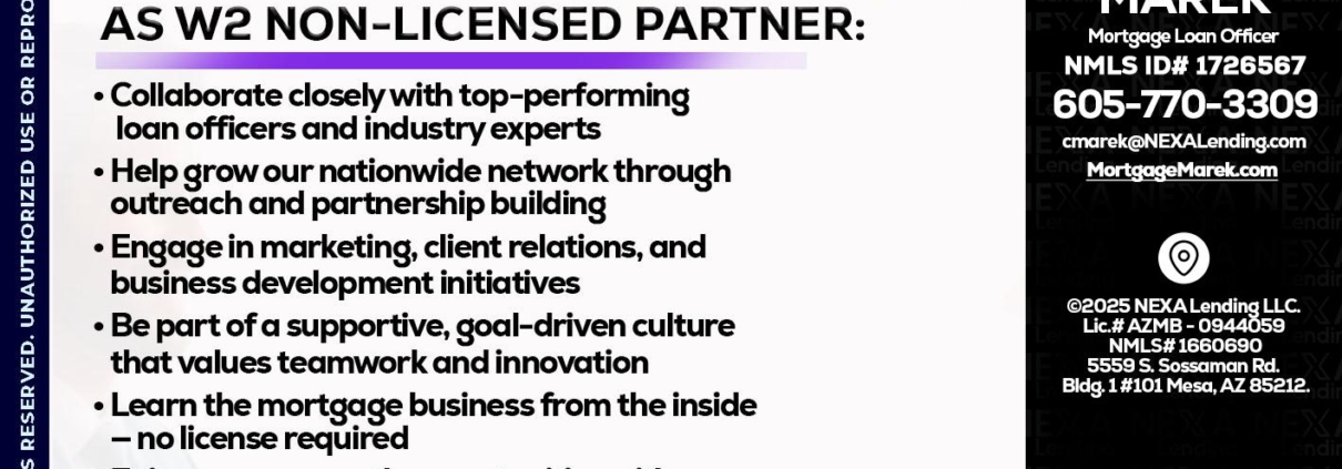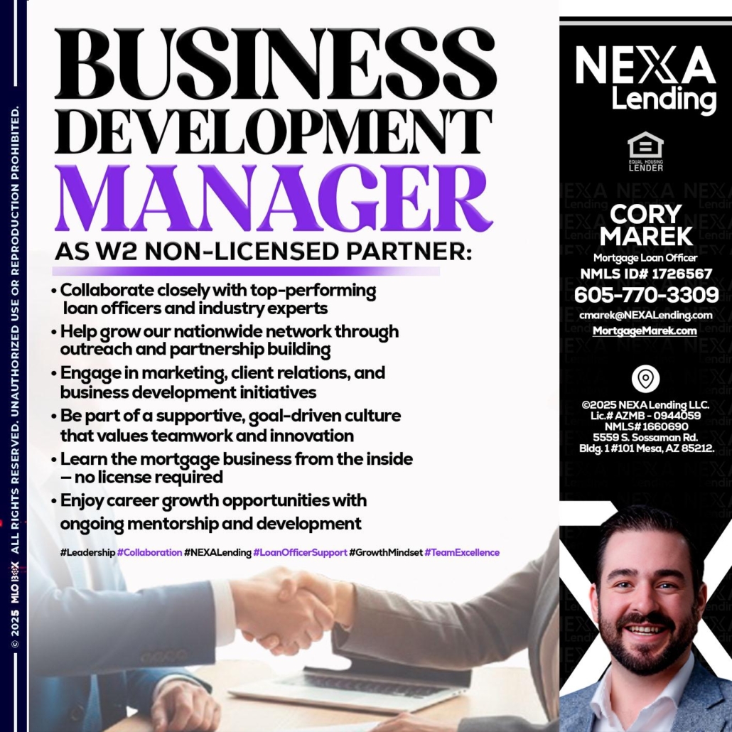 business development - Cory Marek -Mortgage Loan OfficerHi, my name is Cory Marek. I’m a Loan Officer with NEXA Mortgage LLC., offering personalized mortgage solutions, fast customized quotes, great rates and service with integrity.