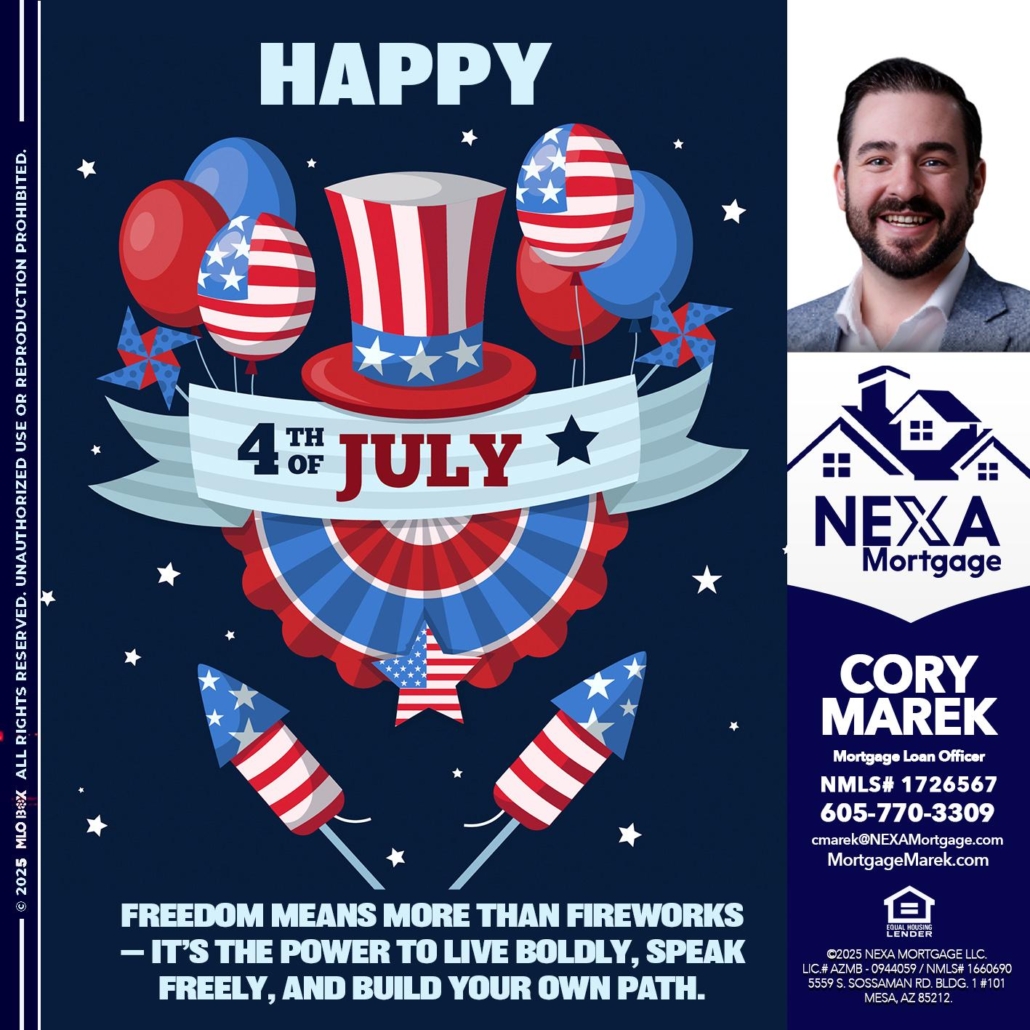 HAPPY 4TH OF JULY - Cory Marek -Mortgage Loan OfficerHi, my name is Cory Marek. I’m a Loan Officer with NEXA Mortgage LLC., offering personalized mortgage solutions, fast customized quotes, great rates and service with integrity.